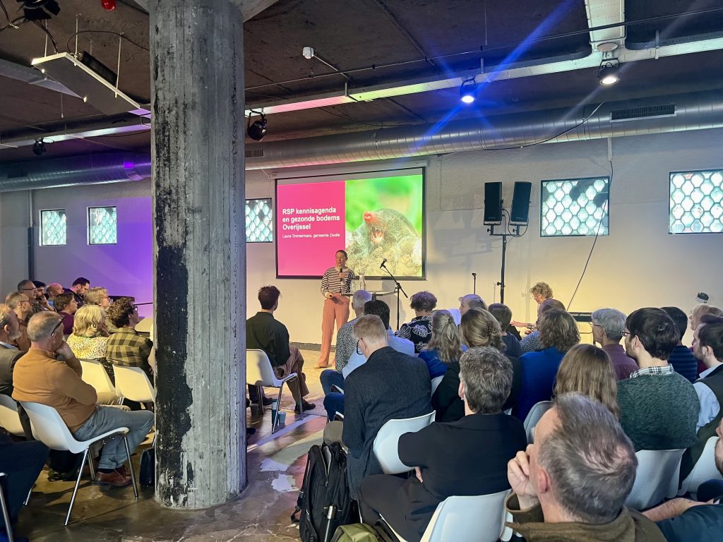 Een grauwe herfstdag buiten, maar binnen in Het Koelhuis in Zutphen gonst het van de energie. Meer dan honderd bodemprofessionals uit Overijssel en Gelderland komen samen voor de tweede gezamenlijke Kennis- netwerkdag Bodem Oost-Nederland. Beleidsmakers, onderzoekers, adviseurs en toezichthouders delen er inzichten over de gezonde bodem, nieuwe meetmethoden, samenwerking in het werkveld en actuele thema’s als PFAS en microplastics in de bodem. Dagvoorzitter Annelies de Graaf (coördinator GOO) opent de dag en benadrukt hoe waardevol het is dat de twee provincies samen optrekken: