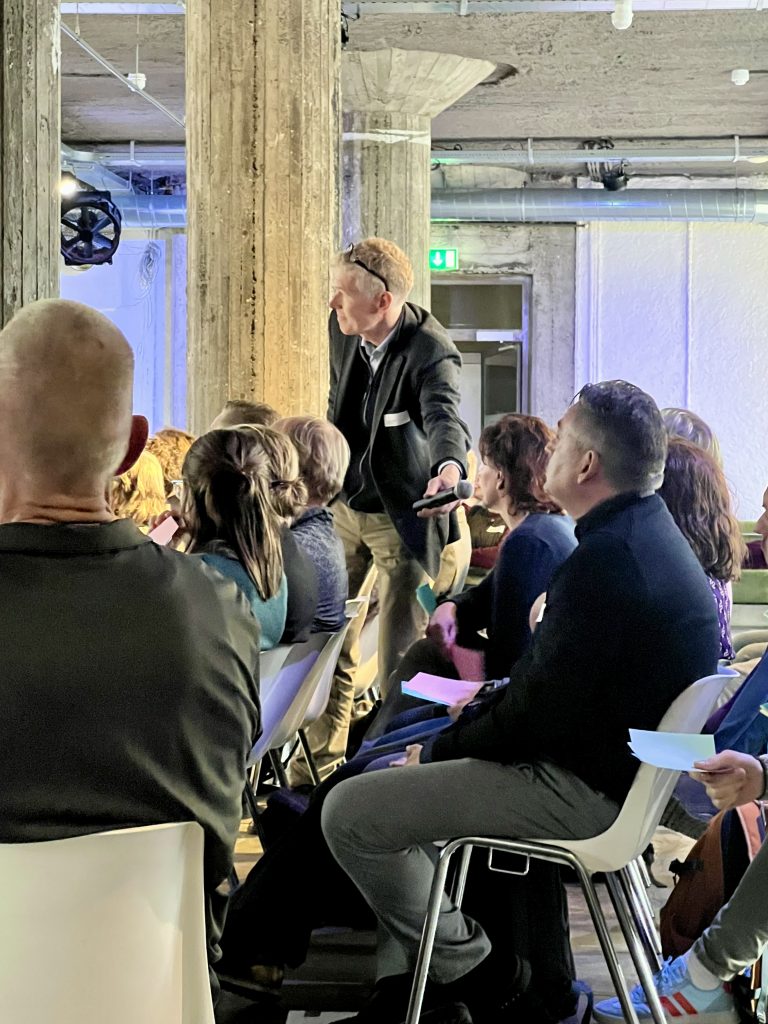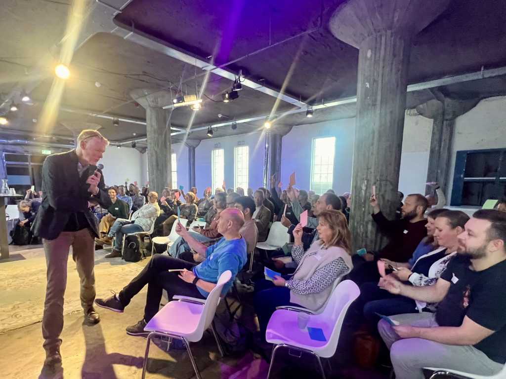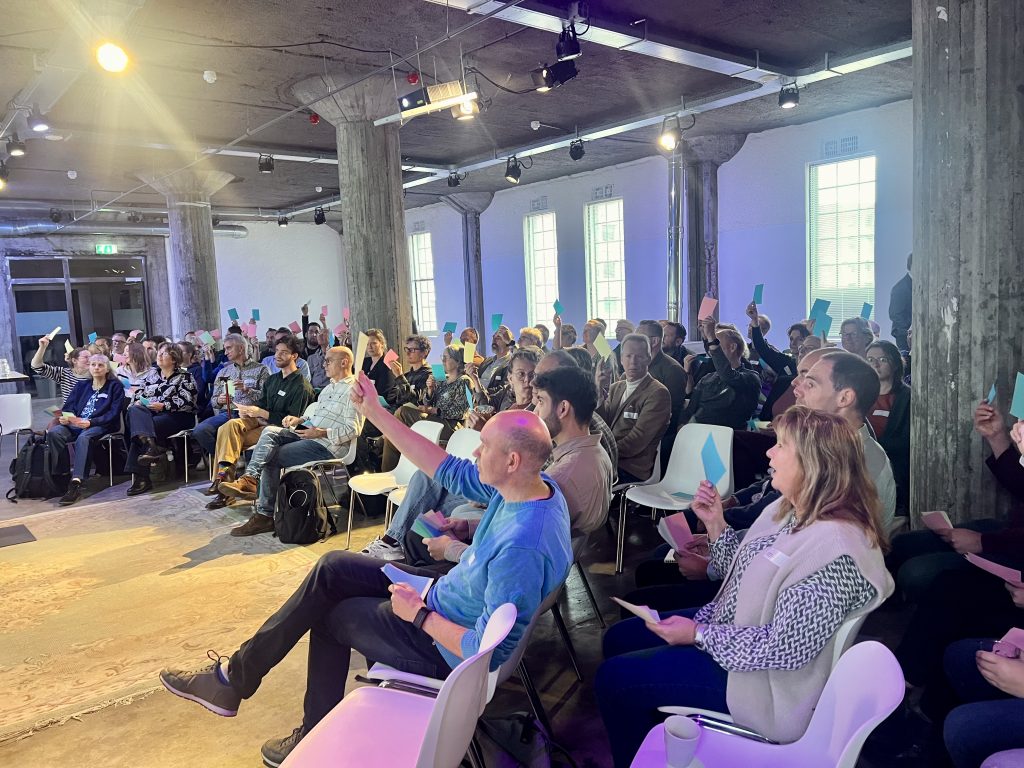 Het ochtendprogramma eindigt luchtig én inhoudelijk met een PFAS-quiz, geleid door Jasper Lackin (provincie Overijssel) en Jos Reijerink (provincie Gelderland) en Paul Oude Boerrigter (provincie Gelderland). Met gekleurde briefjes beantwoordt het publiek meerkeuzevragen over de herkomst, verspreiding en aanpak van PFAS.