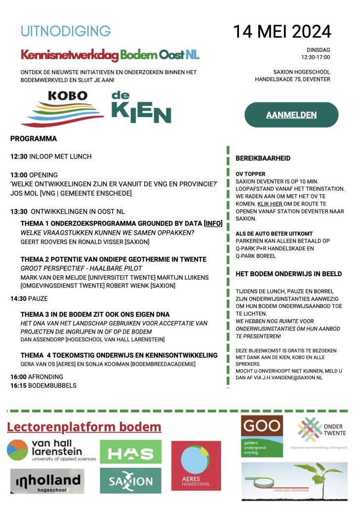 KOBO, Kien, NL ingenieurs en Grounded organiseren op 14 mei 2024 een Kennisnetwerkdag rondom bodem voor Oost NL. Meer informatie over het programma en het aanmelden lees je in deze uitnodiging.